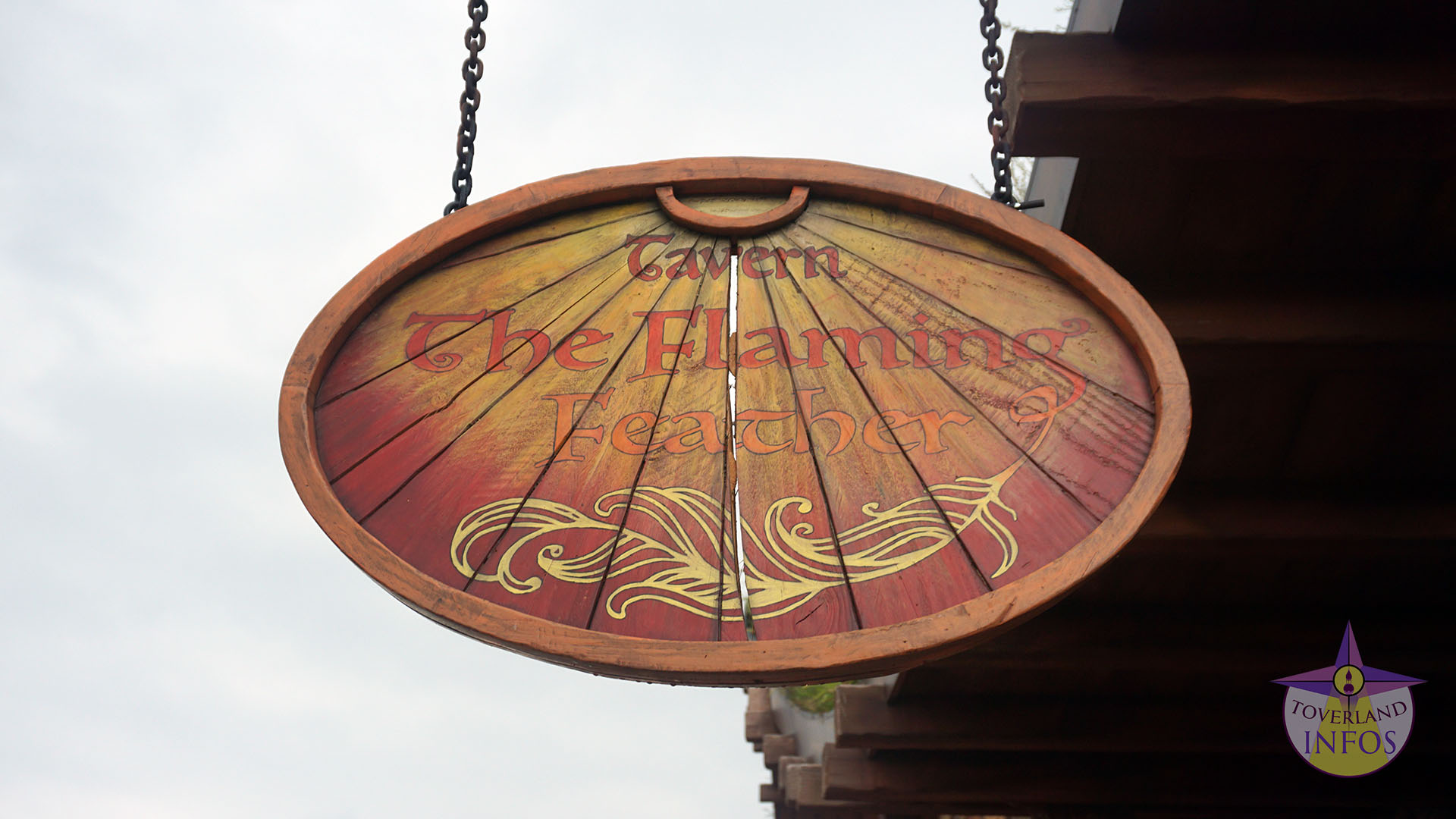 The Flaming Feather wurde als magische Sternwarte thematisiert und erinnert an eine keltische Taverne. Das Kaminfeuer und das Kerzenlicht unterstützen diesen Charakter. Auffällig an der Gestaltung sind vor allem die vielen Sternkarten sowie die verschiedenen Utensilien aus Avalon. Auf der Homepage des Parks heißt es, dass es sich um eine Gaststätte voller Mythen und Legenden handelt, in der Zauberer und Magier sich schon seit Ewigkeiten versammeln, um unter dem Genuss von einem guten Stück Fleisch und leckeren Getränken über die Magie und den Kampf gegen das Böse zu philosophieren.